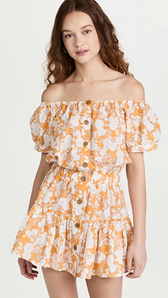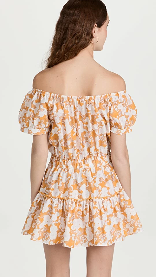 An exceptionally pretty take on off-shoulder style, this lightweight Eberjey mini dress spotlights an illustrated floral print set against a vivid orange background.
