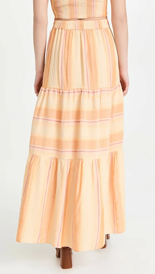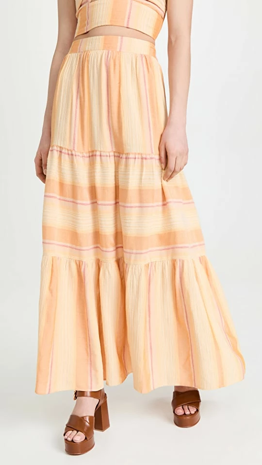 Brighten up your warm-weather wardrobe with this L*Space skirt, which features a full, tiered silhouette and cheerfully-colored stripes. The label’s matching crop top and a pair of strappy sandals complete the look.