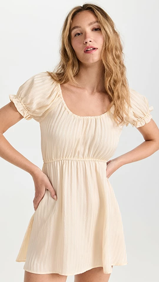- Scoop neck and short puff sleeves with covered elastic cuffs