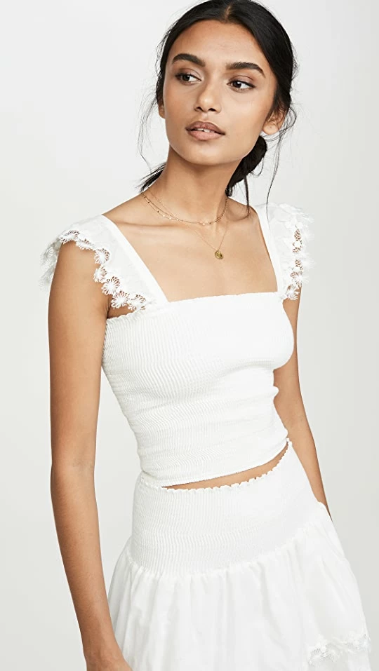 A sweet and summery Peixoto cover-up crop top trimmed with frothy lace. The smocked design adds a retro feel to the easy, pull-on style.