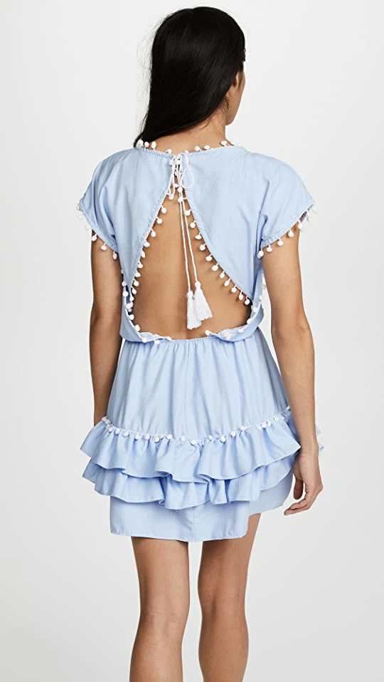 Sky-blue cotton, ruffles, and pom poms add to the charming look of this Peixoto mini dress, while an open back provides an unexpected finishing touch. Strappy sandals and slides both work well with this playful swim cover-up.
