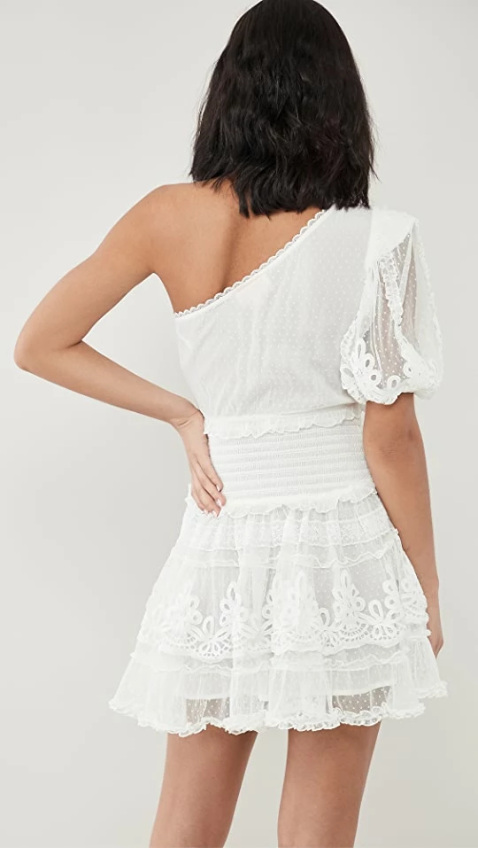An elevated option for your next beach excursion, this ROCOCO SAND cover-up mini dress features an elegant one-shoulder silhouette and lavish embroidered detailing.
