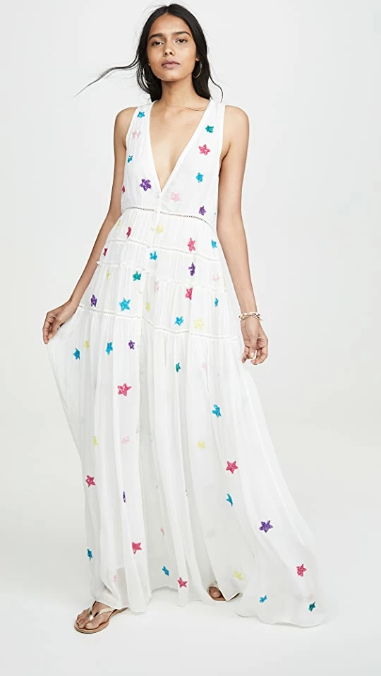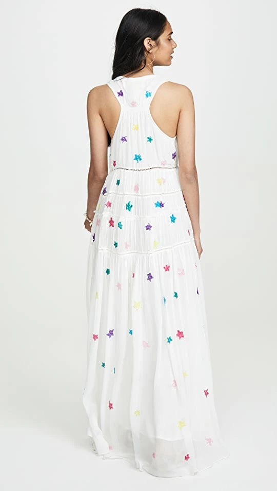We already knew you were a star, this ROCOCO SAND dress is just the icing on the cake. Colorful sequins add a dazzling pop of color to the airy, tiered silhouette.