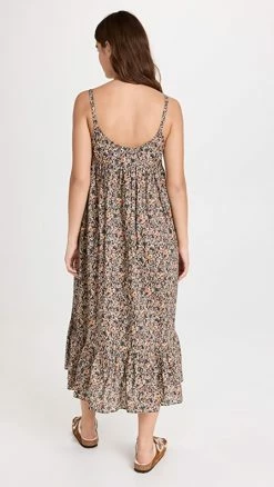 A shimmery Sleeper silk dress in a lovely off-shoulder silhouette, accented with smocking at the waist and soft gathering at the sleeves.