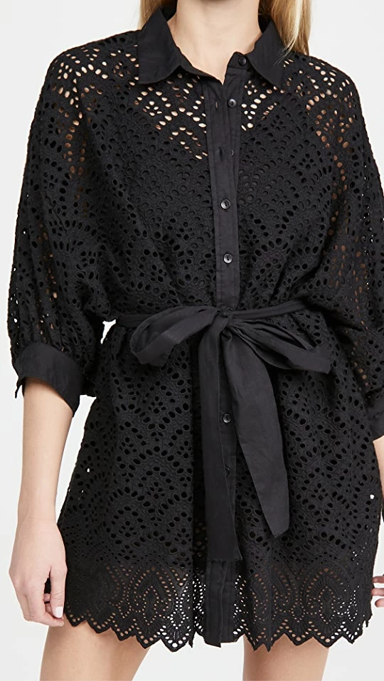 A beach-ready SUNDRESS cover-up dress crafted in sweet, summery eyelet and featuring an optional tie-waist design. Strappy sandals and simple slides work equally well with this pretty piece.