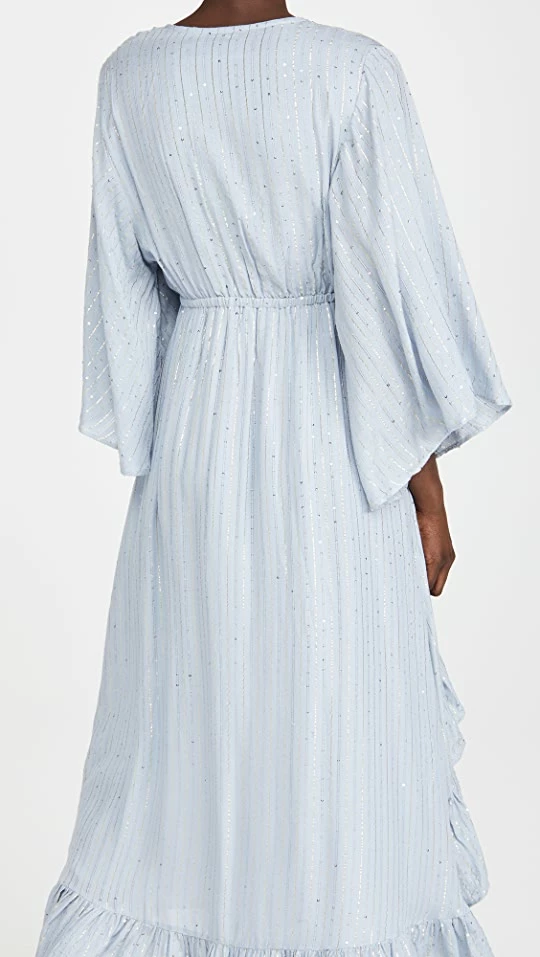 Streaks of metallic thread, a dramatic high-low hem, and a plunging neckline make this SUNDRESS cover-up a dramatic beach-day option. Complete your outfit with the sandals of your choice.