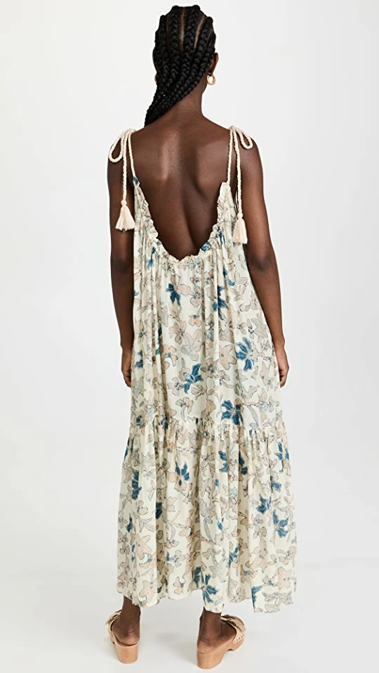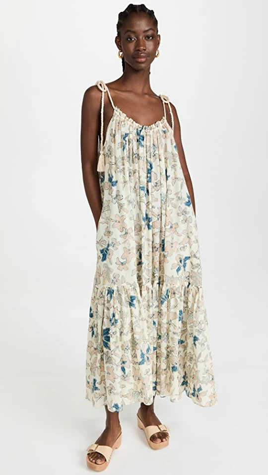 With an intricate abstract pattern and a free and easy silhouette, this Ulla Johnson dress is comfortable and sophisticated in equal measure. Braided contrast shoulder straps add a signature finishing touch. To accessorize, opt for a canvas tote.
